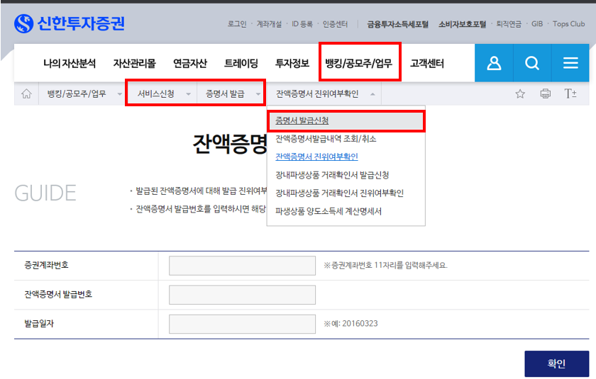 뱅킹/공모주/업무 → 서비스 신청 → 증명서 발급 → 증명서 발급신청