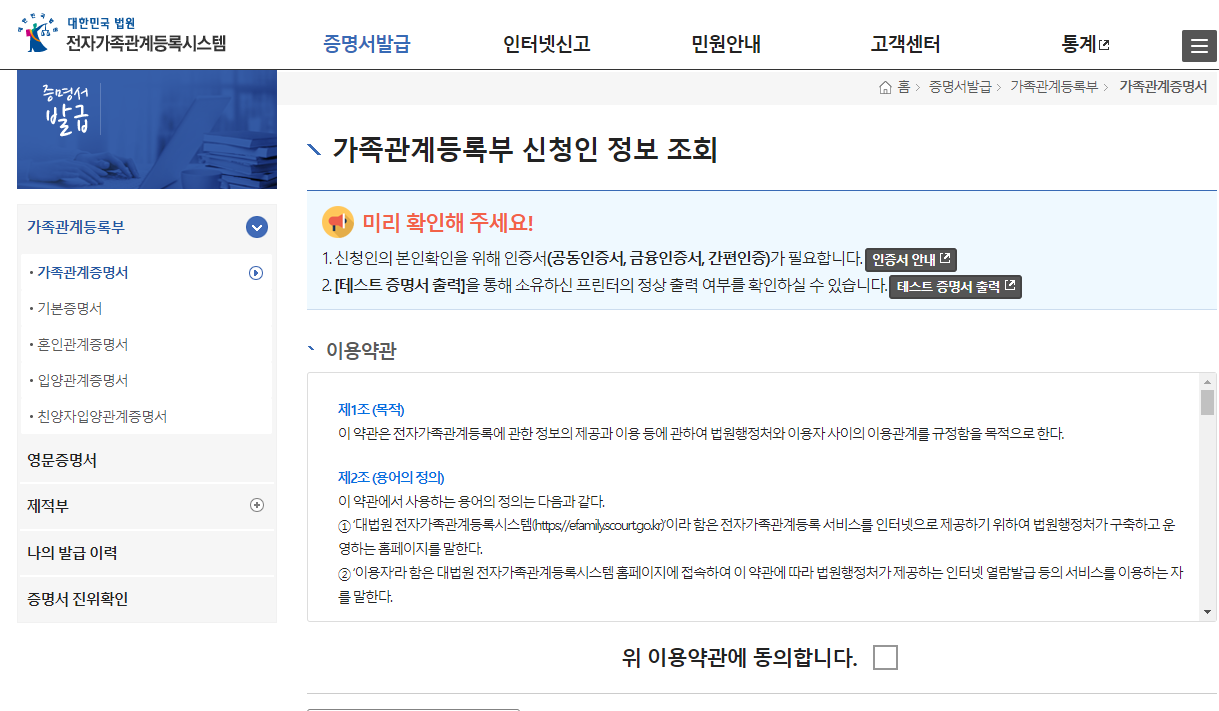 마지막 서류인 가족관계 증명서인데요. 가족관계증명서는 법원의 전자가족관계등록시스템에서 인터넷으로 손쉽게 발급이 가능합니다.