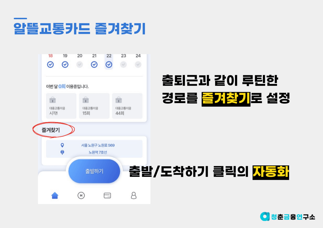 알뜰교통카드의 즐겨찾기 기능이란 자신이 주로 이동하는 경로를 미리 앱에 등록시켜 버튼을 클릭하지 않아도 자동으로 적립될 수 있게 하는 기능을 의미하는데요.