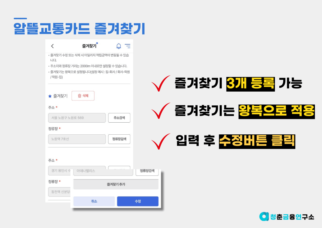 즐겨찾기에서 등록하는 주소와 정류장의 거리에는 2,000m 제한이 있는데요. 알뜰교통카드 마일리지 최대 적립거리가 800m이고 현실적으로 2km 이상을 걸어서 버스, 지하철을 이요아실 일은 거의 없다 판단되기에 크게 신경쓰지 않으셔도 됩니다.