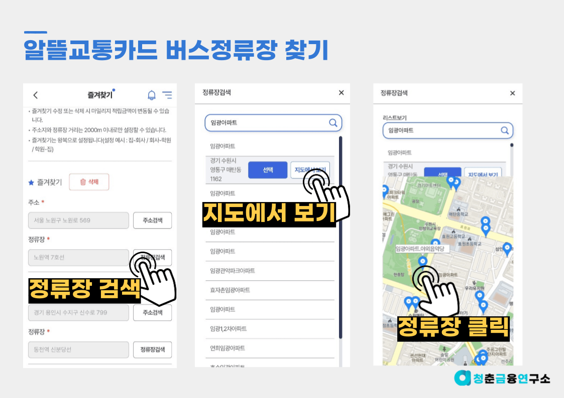 즐겨찾기는 총 3개의 경로 지정이 가능합니다. 각 경로마다 출발/도착지의 주소와 대중교통을 이용할 정류장을 선택해주시면 됩니다.