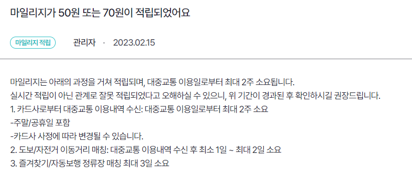 즐겨찾기를 이용해 적립이 되는 경우 처음에는 거리와 무관하게 50원으로 적립액이 표시가 됩니다. 이후 몇 일이 지나면 평소에 적립되던 금액으로 마일리지가 변경되니 놀라지 않으셔도 됩니다.
