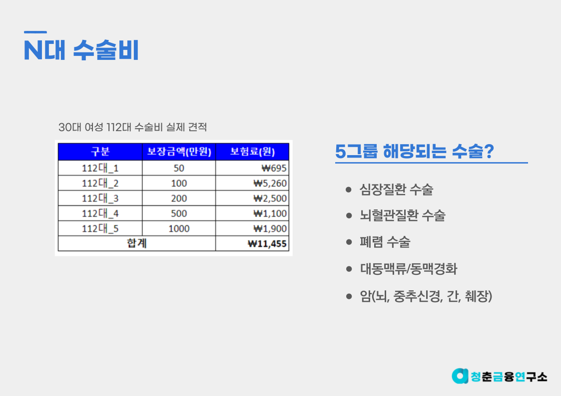 하지만 보험료가 월에 11,000원 정도로 매우 비싸기에 사실 112대 수술비도 가성비 관점에서는 추천하지 않는 수술비 특약 기는 합니다.