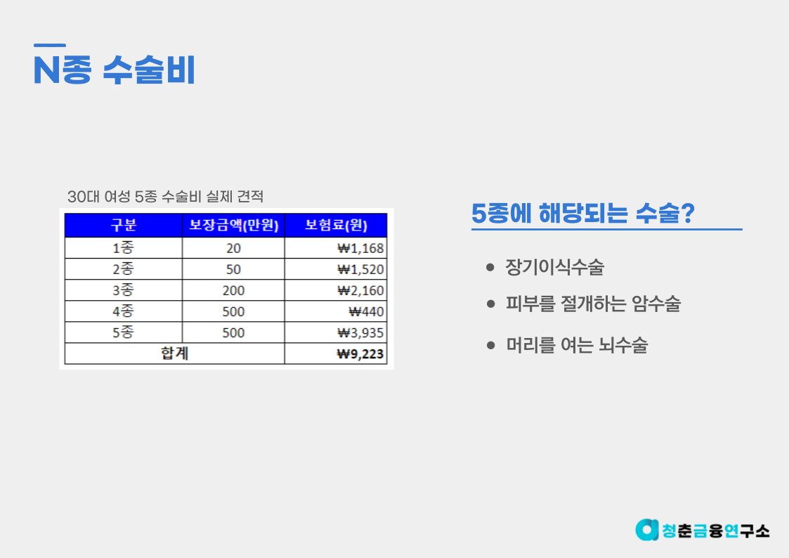 제 생각은 월에 1만 원 이상의 금액을 지불하면서 종 수술비를 가입할 필요는 없다고 생각합니다. 그 이유는 그 정도 금액이면 오히려 암, 뇌, 심장 등과 같이 발병확률이 높고 치료비 및 기간이 긴 질병을 집중 보장하는 편이 더 효율이 좋아 보이기 때문이죠.