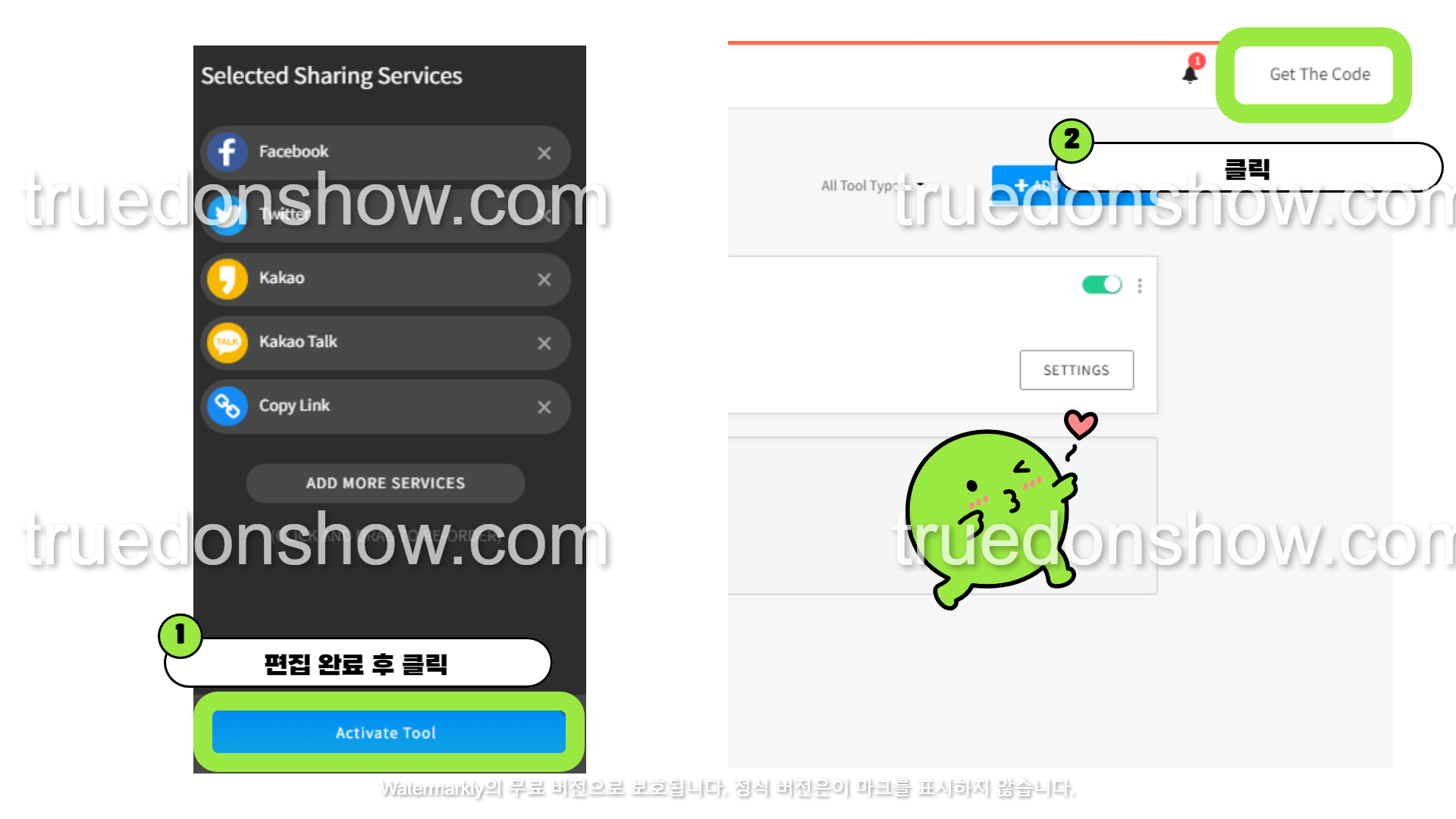 처음에 이 부분이 가장 헷갈렸는데요. 완성버튼을 누르게 되면 제가 제작한 TOOL 리스트가 나오게 됩니다. 그럼 당황하지 말고 오른쪽 상단을 보게 되면 [GET THE CODE]버튼을 눌러주면 됩니다.