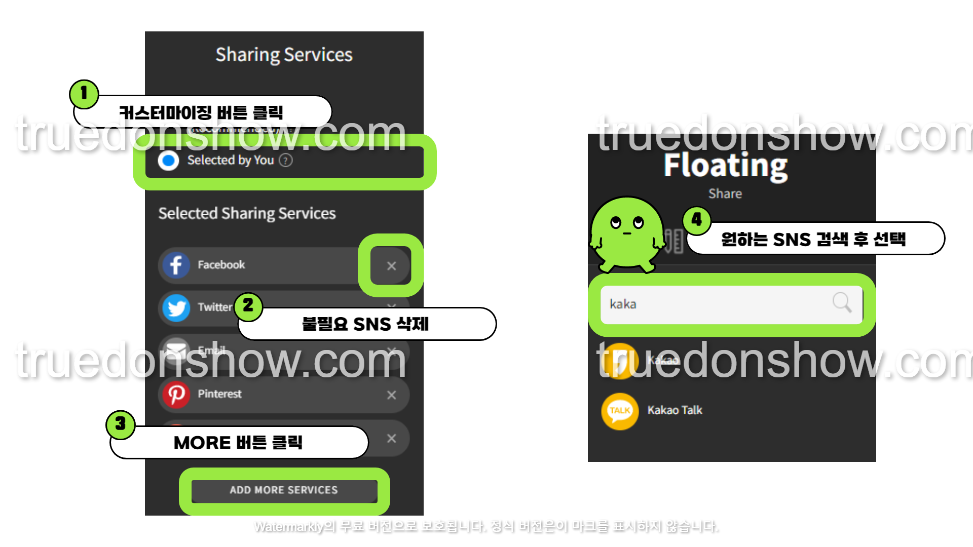 이후 버튼에 어떤 SNS를 추가할 것인지 선택을 해야하는데요. 우선 디폴트로 세팅되어 있는 항목 중 제거하고 싶은 항목을 삭제해줍니다.