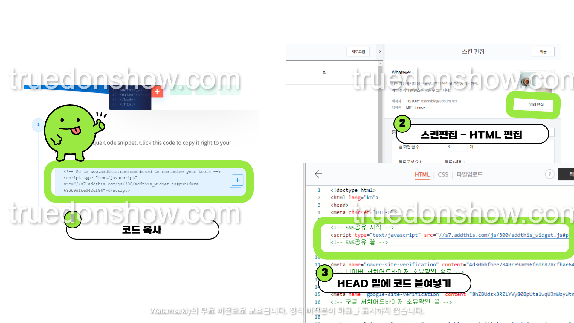 그리고 넣는 위치가 고민되실텐데 사진과 같이 <head> 밑에 넣어주시고 미리보기 버튼을 눌르면 바로 적용되는걸 확인할 수 있어요.