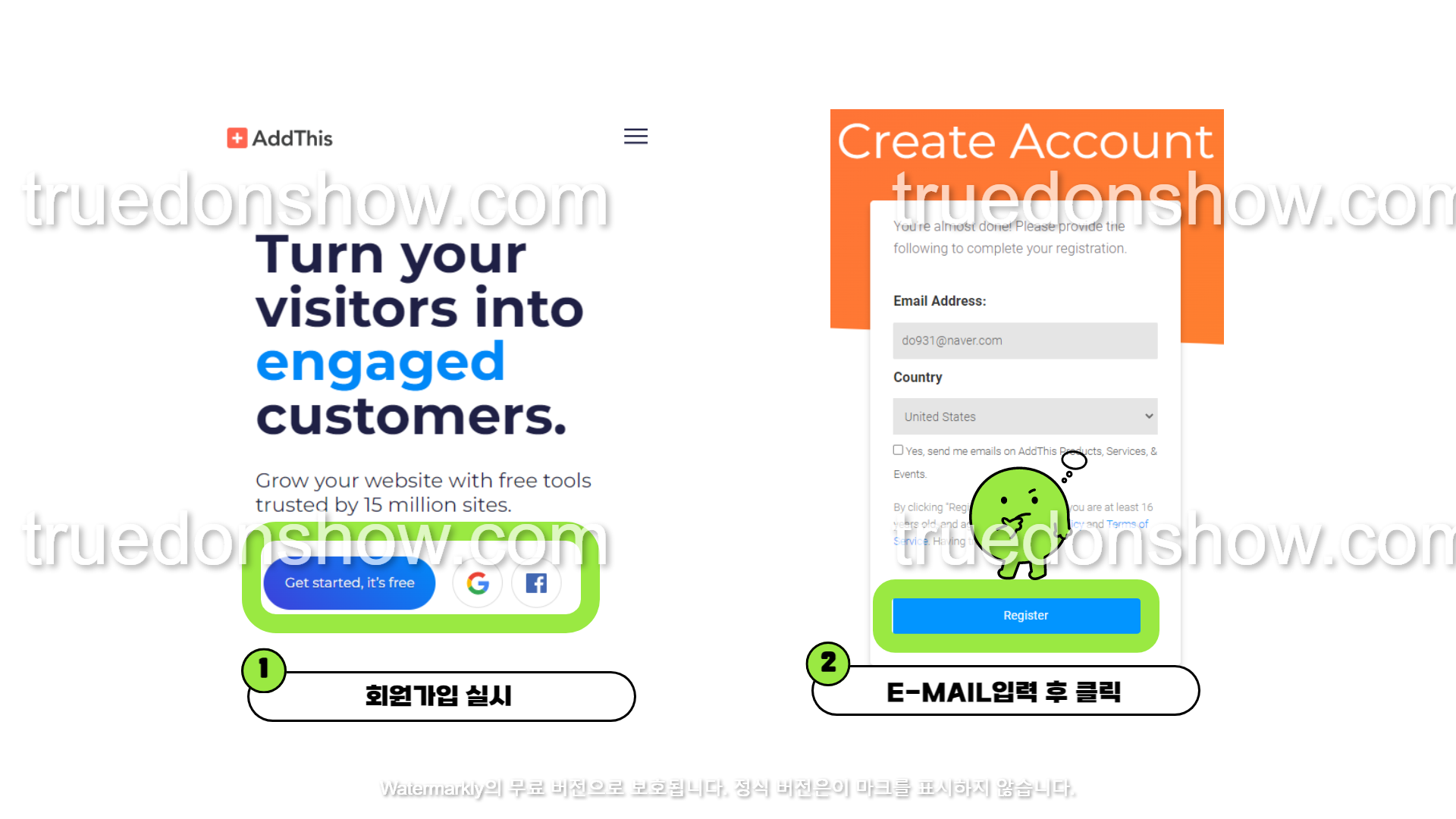 버튼생성을 위해서는 우선 회원가입 절차가 필요해요. 구글, 페이스북을 통한 간편 회원가입도 가능하니 편하신 방법으로 가입을 진행해주시면 됩니다.