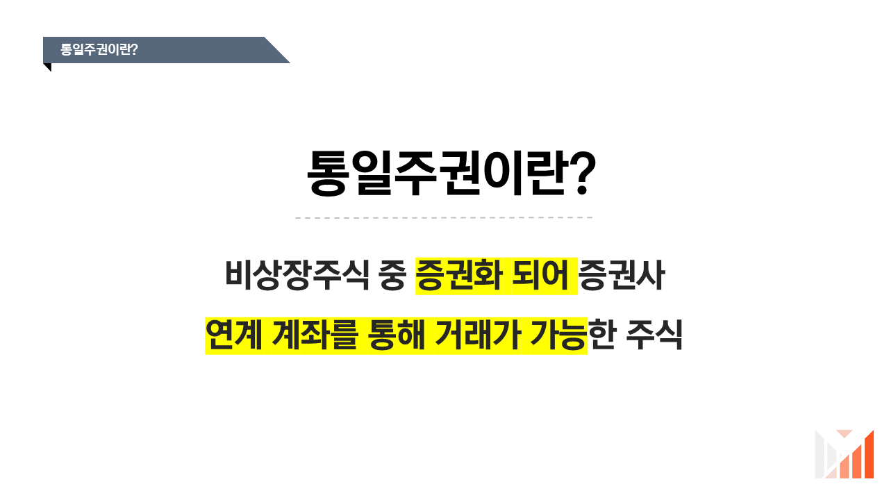 증권 예탁원에 예탁이 가능하도록 증권화한 주식을 의미합니다. 주식계좌로 이체가 가능하기에 거래가 편하다는 장점이 있죠. 실제로 통일주권이 발행된 종목의 비상장 주식을 사게 되면 증권계좌에서 해당 주식이 들어와 있는 것을 확인이 가능합니다.