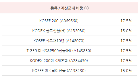 국내외 주식 및 채권뿐만 아니라 금과 현금까지 자산을 배분함으로써 자산배분의 효과를 극대화하였음을 확인할 수 있는데요.