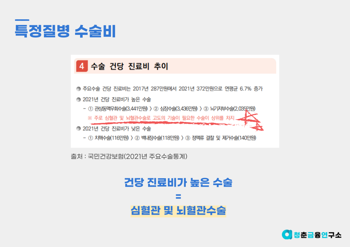앞선 글에서 질병 종 수술비, N대 수술비 등 다양한 수술비 가입에는 회의적이였지만 뇌, 심장과 같이 질병을 특정하는 허혈성 심장질환 및 뇌혈관 질환 수술비 특약은 적극적으로 가입을 검토해볼 필요가 있습니다.