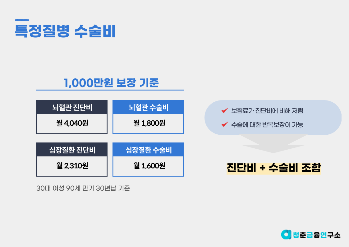 으로 구분 할 수 있는데요. 수술비의 경우 진단비에 비해 상대적으로 보험료가 저렴하고 담보가 소멸되지 않고 재수술 시 반복 지급이 가능하기에 뇌혈관질환 수술비, 허혈성 심장질환 수술비와 같이 넓은 범위로 수술비를 준비할 필요가 있어요.