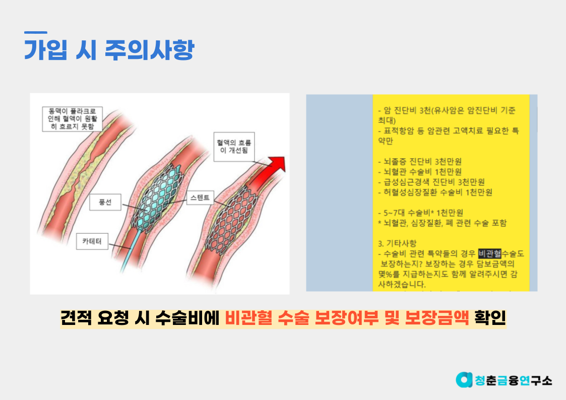 그렇기에 뇌, 심장과 같이 수술비 특약을 가입하는 경우 비관혈 수술도 보장이 되는지, 보장이 된다면 보장금액의 100%가 맞는지를 꼭 한번 확인할 필요가 있는데요.