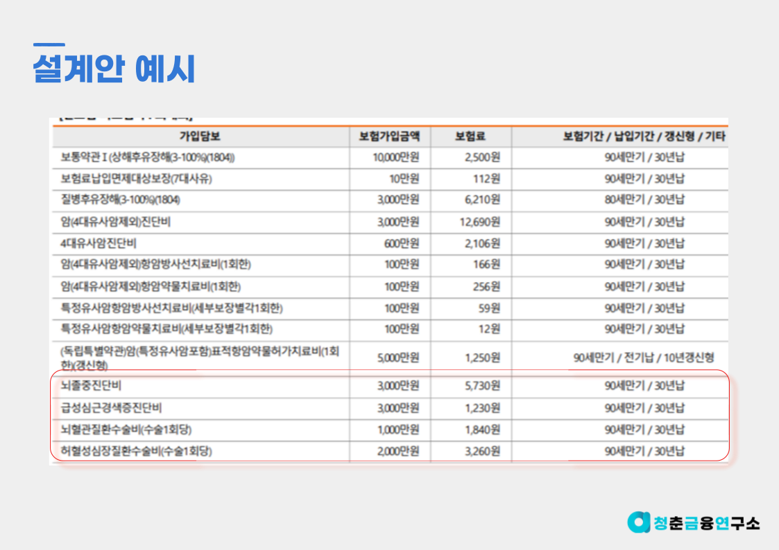 심장, 뇌 관련 질환에 대해 진단비와 수술비 특약을 적절히 조합하여 설계를 한다면 보험료도 낮추면서 충분한 보장금액 확보가 가능하기에 허혈성 심장질환 및 뇌혈관 수술비 특약은 검토해 볼 수술비라 생각합니다.