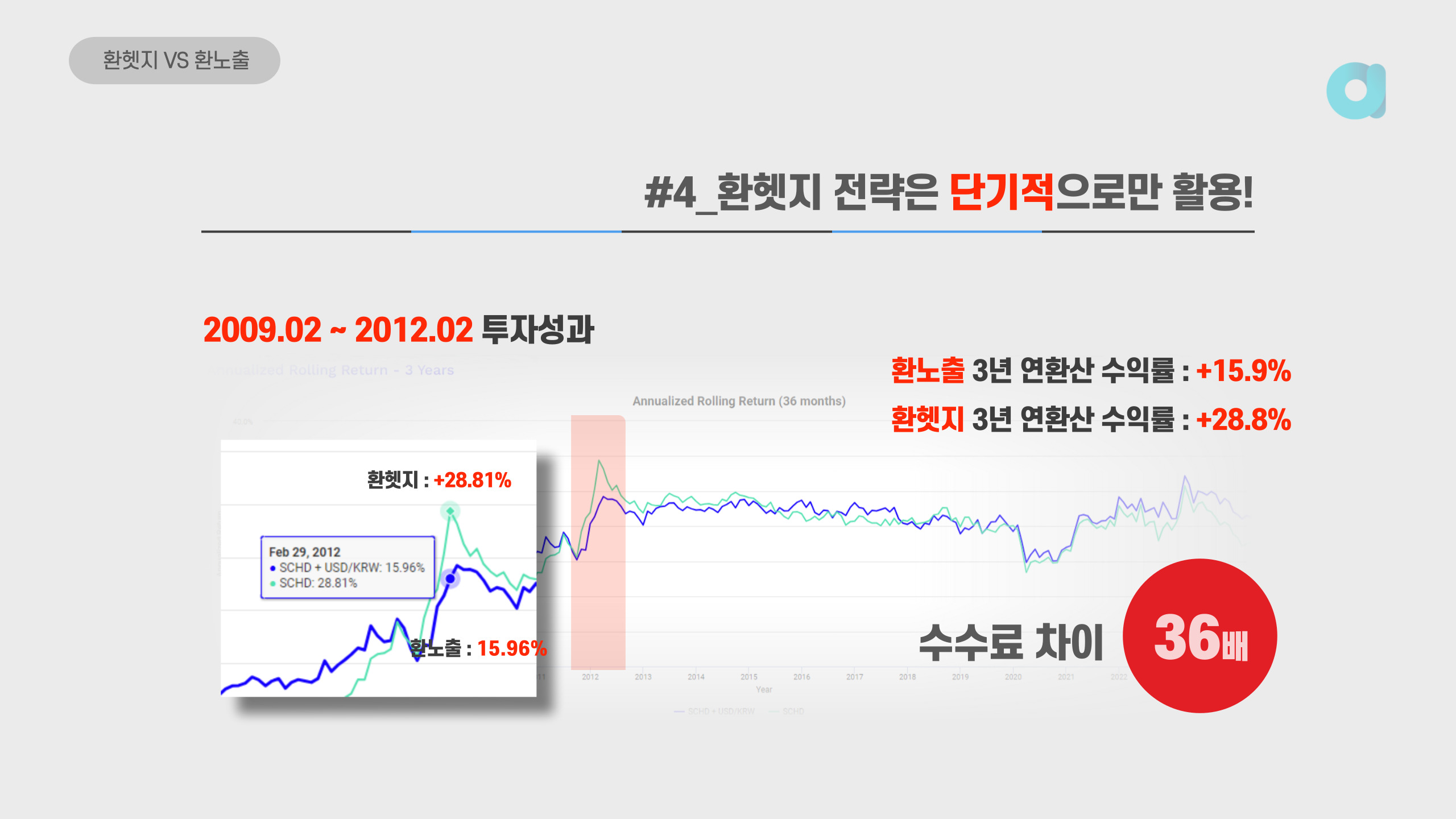 하지만 시간을 조금 더 옮겨 환율이 하락하는 기간인 2009년 02월부터 2012년 02월까지의 성과를 살펴보게 되면 3년간 환노출 연환산 수익률은 15.9%, 환헷지 연환산 수익률은 28.8%로 환율을 헷지 하는 전략이 압도적으로 좋은 것을 확인 할 수 있죠.