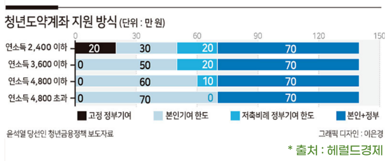 청년계좌의 경우 연소득별 지원 방식에 차등을 두고 있습니다. 연소득별로 월 납입금액 70만원에 대해 지원금액을 살펴보면 아래와 같은데요.