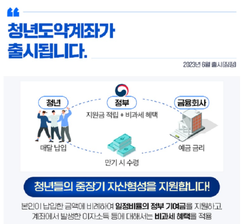 청년도약계좌의 경우 청년들의 목돈마련을 정부에서 지원해주는 정책으로 2023년 6월 출시 예정인 정책금융 상품입니다.