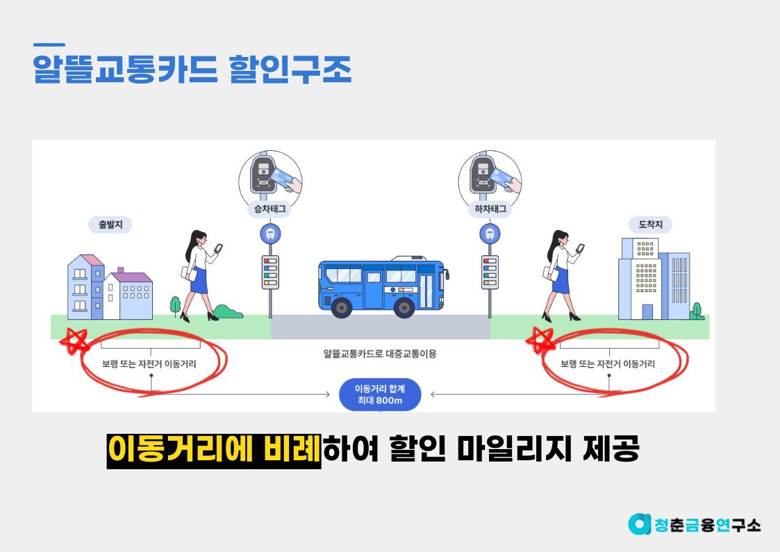 알뜰교통카드는 아래와 같이 대중교통을 이용하기 위해 이동한 거리에 비례하여서 마일리지를 제공해요. 최대치를 적립하기 위한 거리는 800m이구요.