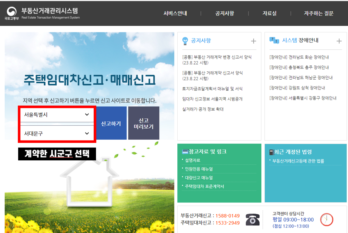 위 링크를 클릭하여 사이트를 접속하시면 국토교통부의 부동산거래관리시스템에 접속 할 수 있는데요. 전월세 계약을 진행한 시군구를 선택해 주시고 신고하기 버튼을 눌러주시면 됩니다.