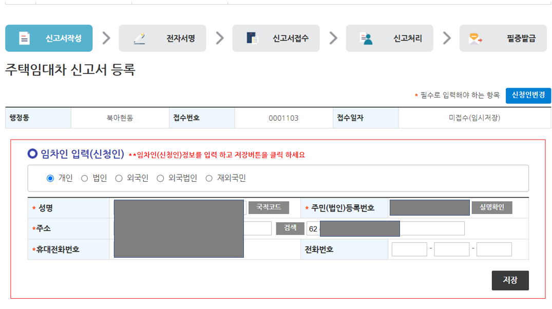 우선, 신청인 정보를 입력 후에 저장버튼을 눌러주고 이후 요청하는 입력값을 입력해주면 되는데요. 임차인, 임대인의 주소 및 정보의 경우 계약서와 동/호수까지 동일해야하니 주의하세요!