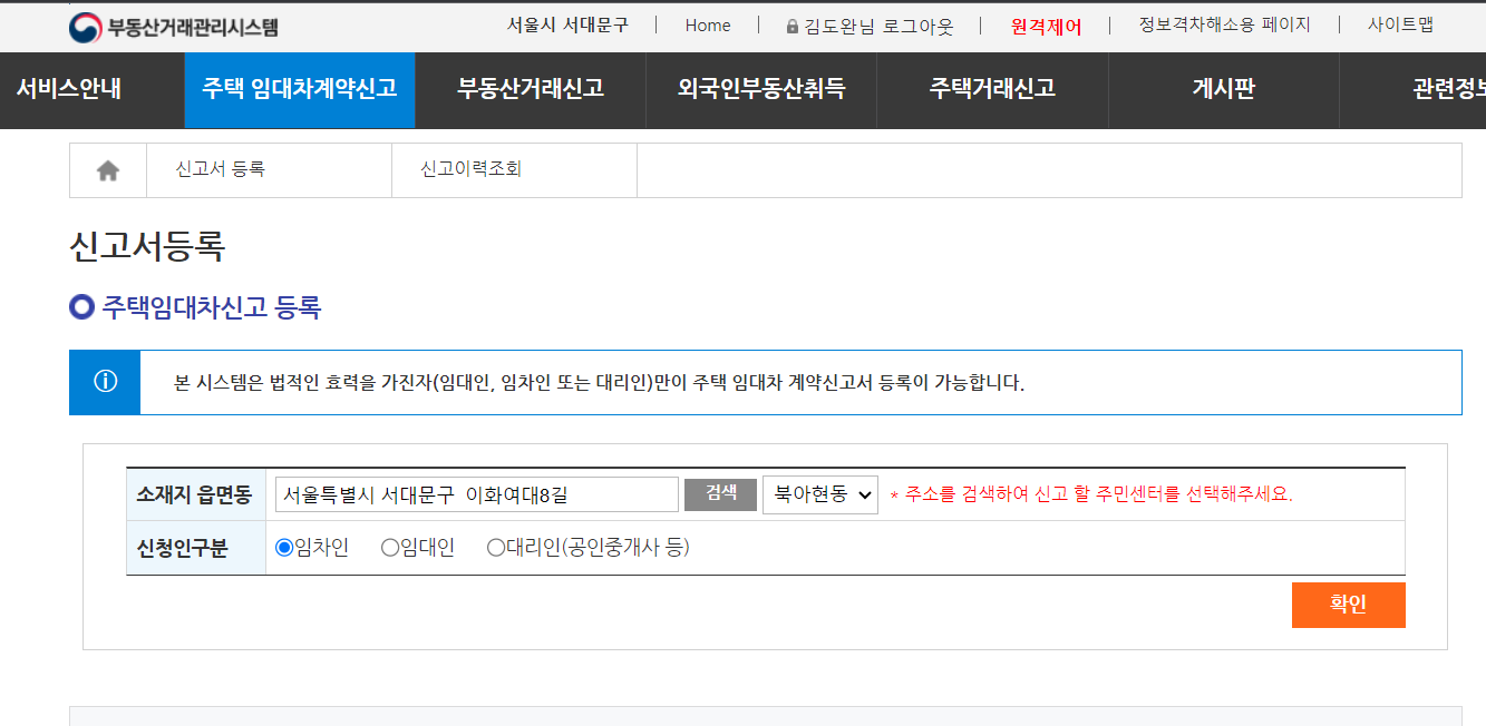 신고하고자 하는 물건의 주소를 입력하게 되면 신고할 주민센터가 자동적으로 선택되게 됩니다. 이후 신청인 구분을 선택해줘야 하는데요. 저는 집을 빌리는 입장임으로 임차인을 선택 후 진행하였습니다.