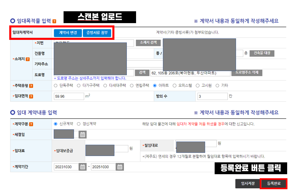 이후 앞서 스캔한 임대차계약서 스캔파일을 업로드 후, 계약서 내용을 바탕으로 계약지 물건정보, 계약금액, 기간 등을 입력 및 등록해주시면 됩니다.