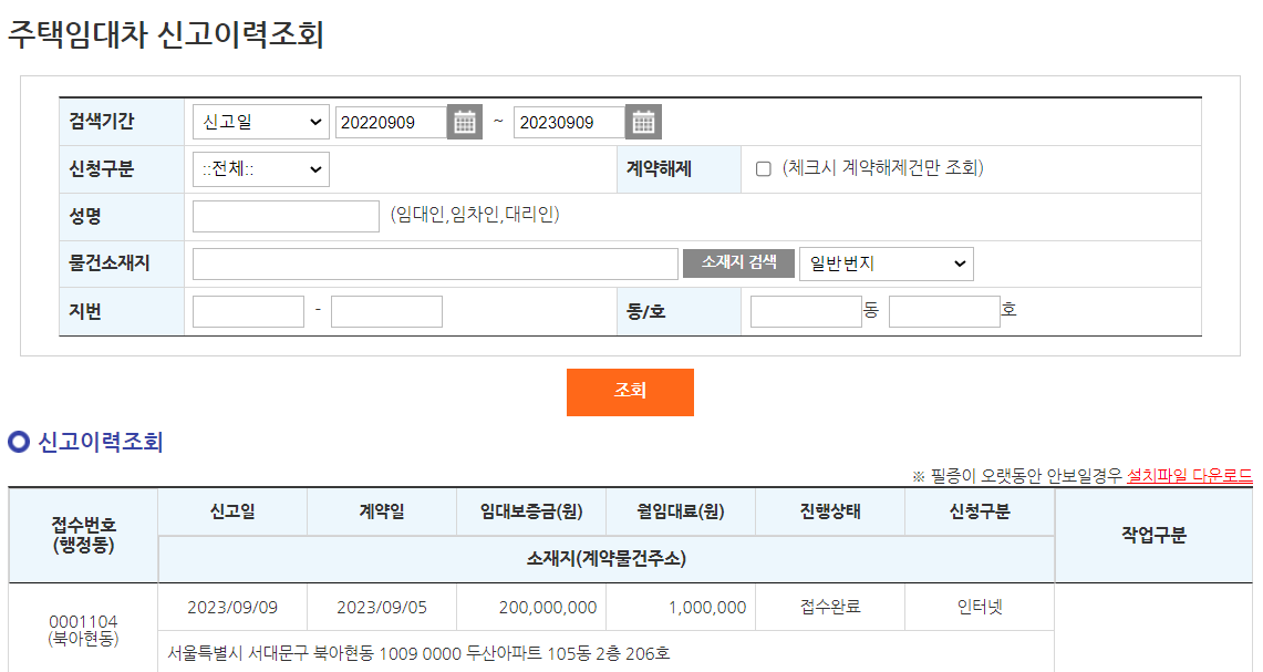 등록완료 후 전자서명을 진행하면 신청이 완료되는데요. 신청이 완료된 사항은 아래와 같이 주택임대차 신고이력조회에서 진행상황을 확인 할 수 있습니다.