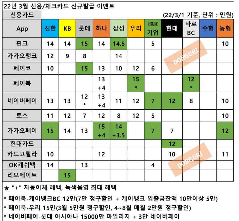같은 카드사, 카드도 어디서 발급을 받느냐에 따라 많게는 6만원 이상 차이가 발생합니다. 오늘은 23년 3월 기준 가장 혜택이 좋은 카드사를 바로 확인 할 수 있도록 정리했으니 카드풍차 돌리기를 진행하시는데 참고하세요.