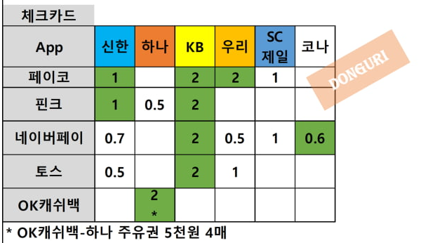 현재 진행중인 신용카드 캐시백 이벤트 현황입니다. 초록색으로 표시된 부분이 카드사별 가장 혜택이 좋은 플랫폼이라 생각하시면 됩니다.