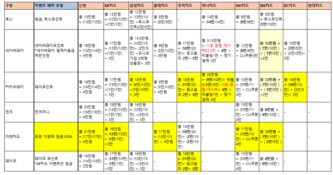 현재 진행중인 신용카드 캐시백 이벤트 현황입니다. 초록색으로 표시된 부분이 카드사별 가장 혜택이 좋은 플랫폼이라 생각하시면 됩니다.(출처 : 뽐뿌 동구리님)