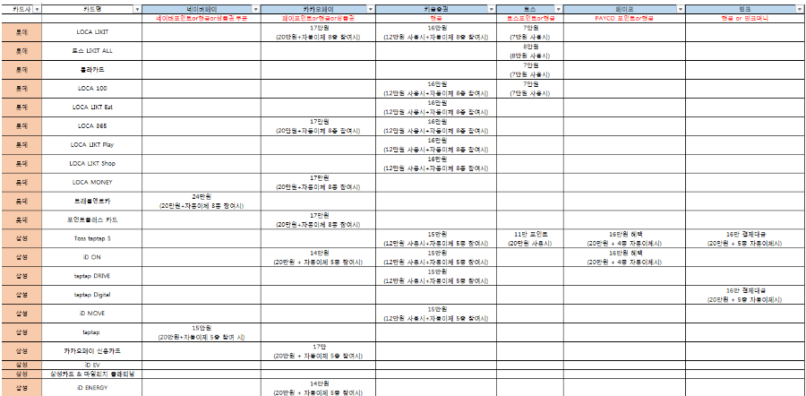 카드사별로 가장 혜택이 많은 이벤트 페이지를 정리해놓은 엑셀파일 입니다. 해당 파일의 경우 뽐뿌에서 가져온 자료입니다.