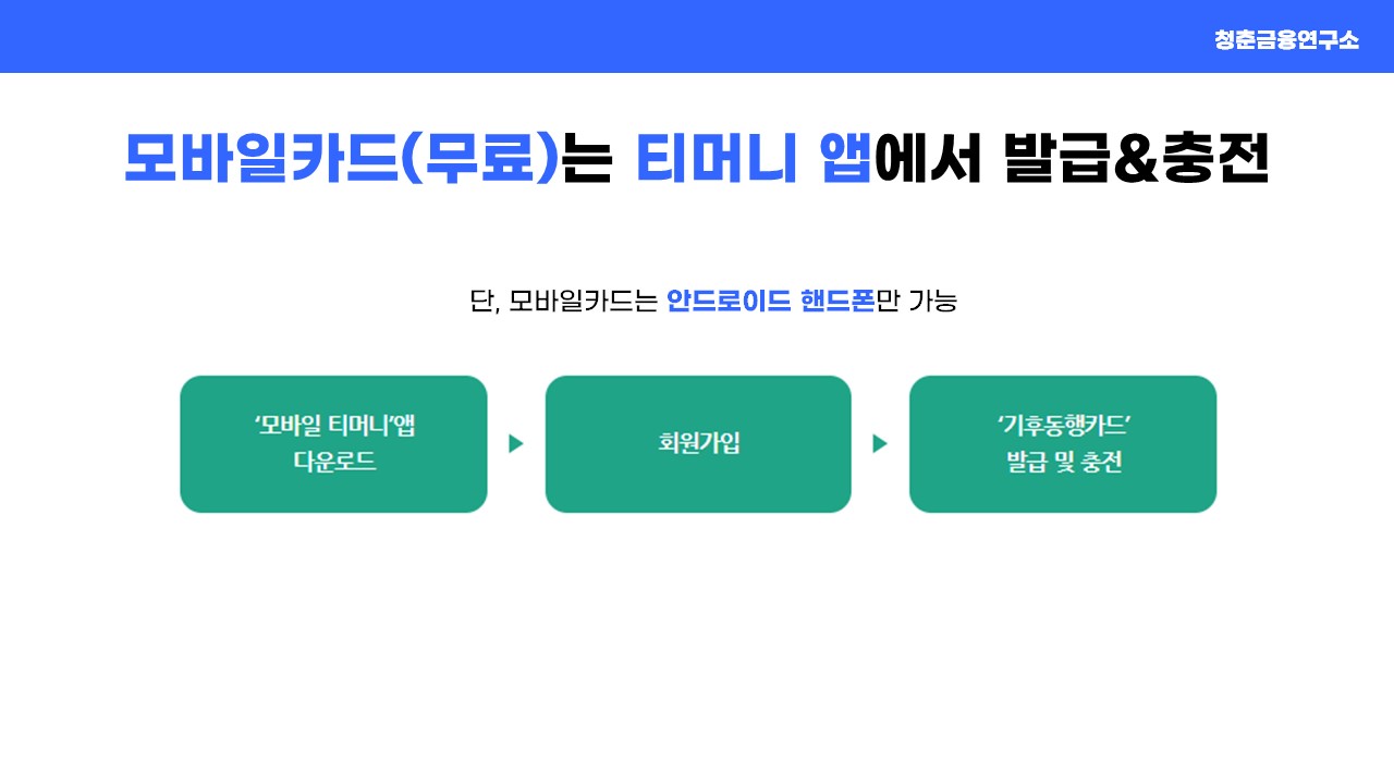 모바일 카드의 경우 모바일 티머니 앱을 설치 후 회원가입을 하게되면 기후동행카드 발급 및 충전이 가능한데요. 설치 링크는 아래 배너를 참고하시길 바랍니다.