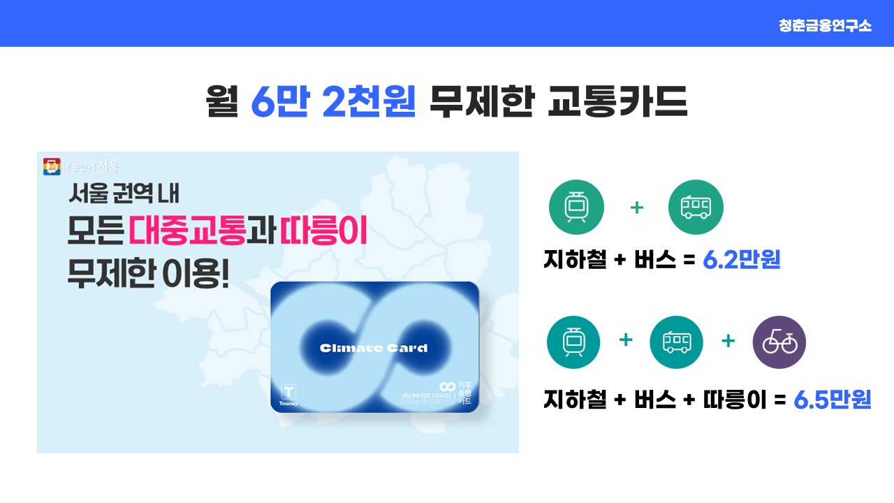 즉, 서울시내 대중교통의 정기권과 같은 개념인데요. 만약 거주하는 집이 서울에 있고 서울 내 직장을 지하철, 버스로 출퇴근 하는 직장인이라면 해당 카드의 사용을 한번 검토해 볼 수 있는데요. 1달 영업일을 21일로 가정 시, 평일 출퇴근 대중교통 비용으로 주말에 이용하는 대중교통을 무료로 이용할 수 있는 정도에 금액이라 생각하시면 될 것 같습니다.