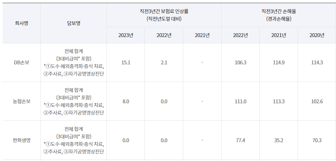 그렇기에 지난 3년간의 보험사별 손해율 및 보험료 인상률을 참고하면 어떤 보험사의 실비(실손) 보험을 선택해야 하는지 기준을 세우실 수 있으실 겁니다.