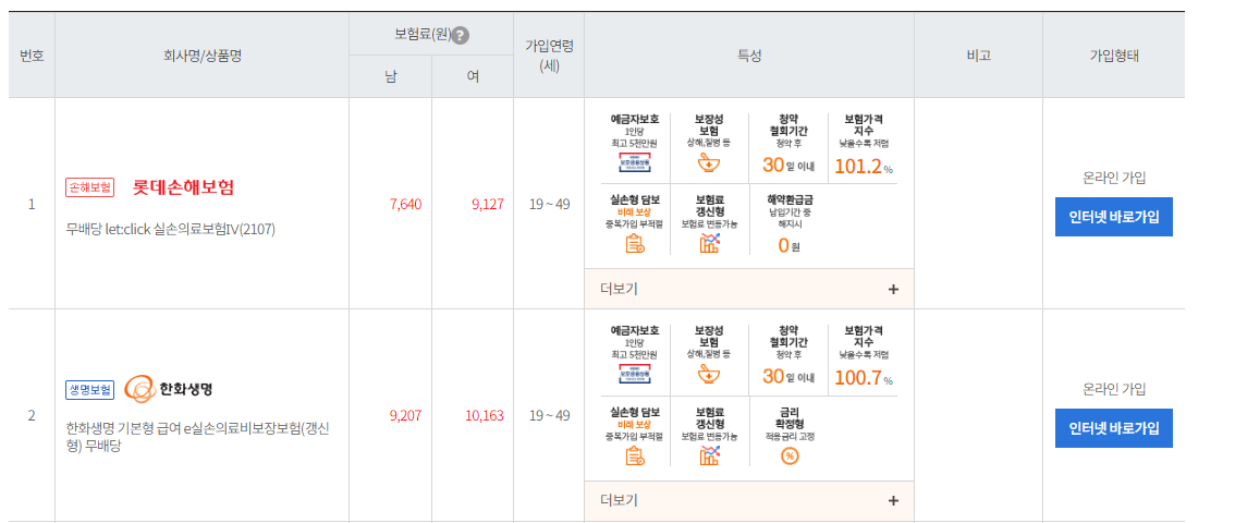 이 중 가장 저렴한 2개 보험사를 기준으로 비교를 해보도록 할게요. 보험료를 기준으로만 보면 롯데실손보험이 한화생명보다 약 20% 정도 저렴한 걸 확인할 수 있는데요.