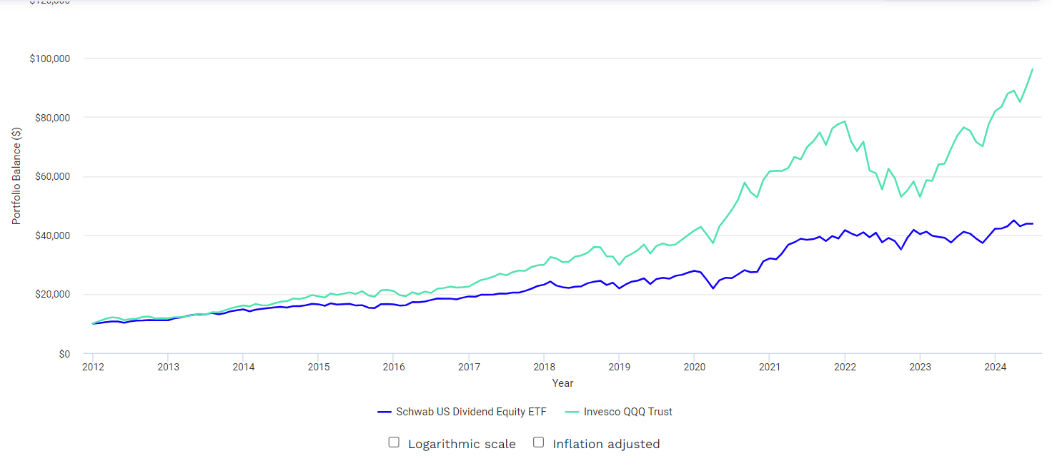 그래서 지난 12년간 미국배당다우존스와 나스닥지수 ETF의 수익률을 비교해보면 12.6%, 19.9%로 7%이상 차이가 발생하는데요. 연 평균 수익률이 12% 이상으로 정말 엄청난 성과를 보여왔지만 역시 지난 10년 최고의 ETF인 나스닥 추종 ETF의 벽을 넘어서지는 못했습니다.