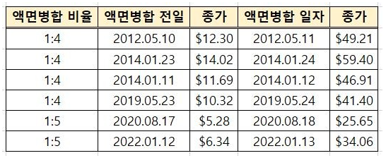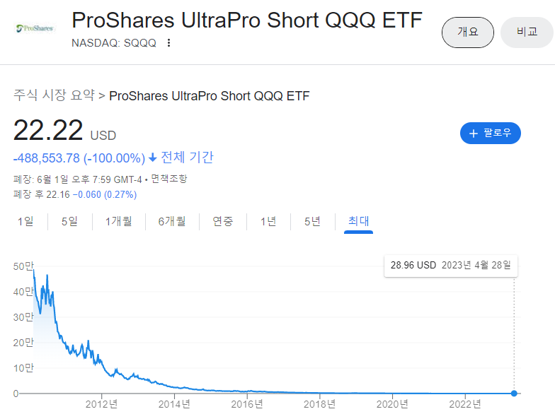 SQQQ의 경우 나스닥이 지속적으로 우상향함에 따라 위와 같은 그래프를 보여줌에도 불구하고 6번의 액면병합을 통해 수익률은 -100%에 수렴하지만 현재도 1주당 $22에 거래되고 있죠.
