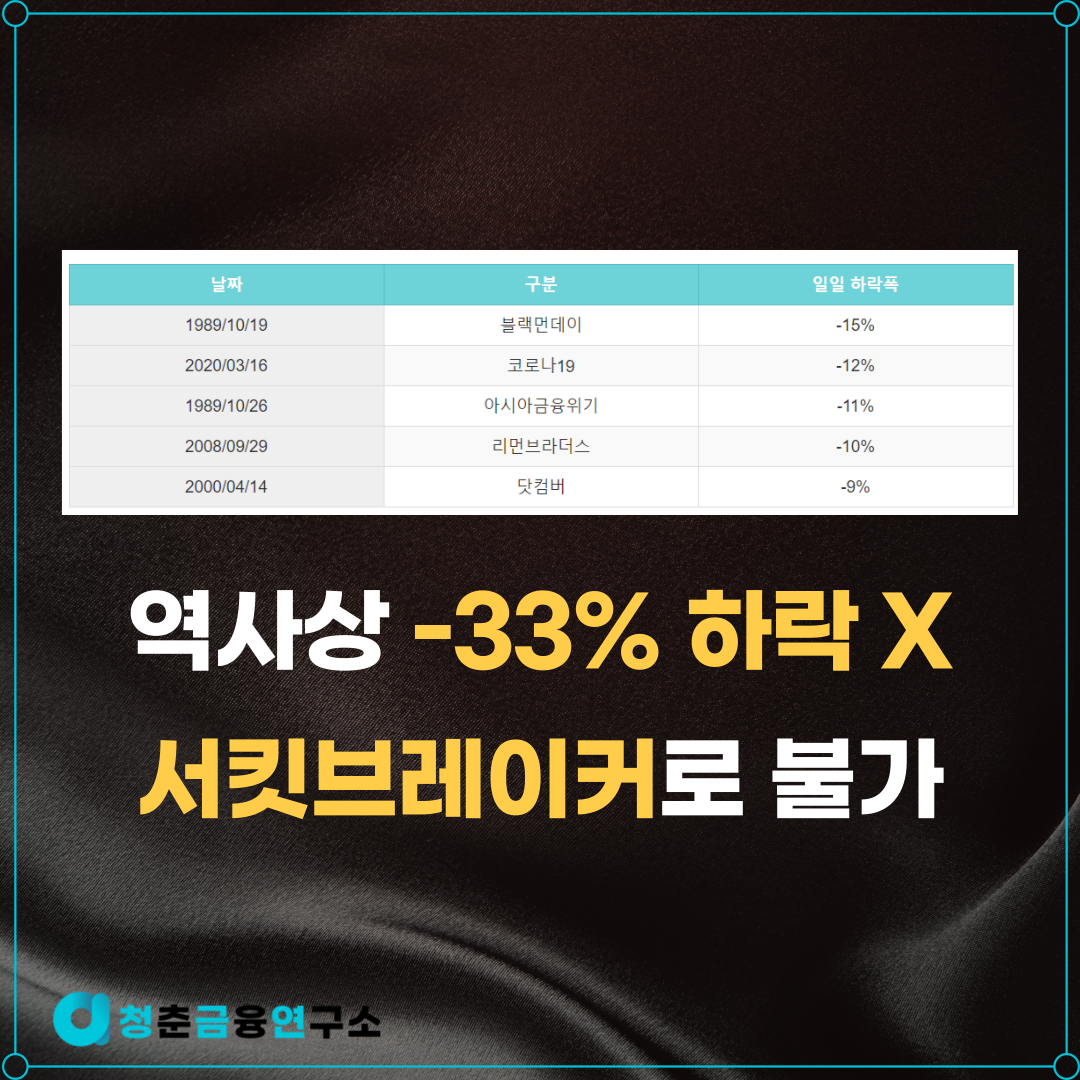 여기에 블랙먼데이를 계기로 미국 금융시스템에 서킷 브레이커(Circuit Breaker)제도가 도입되었는데요. 과대 낙폭을 방지하기 위한 장치로써 그 기준은 아래와 같습니다.