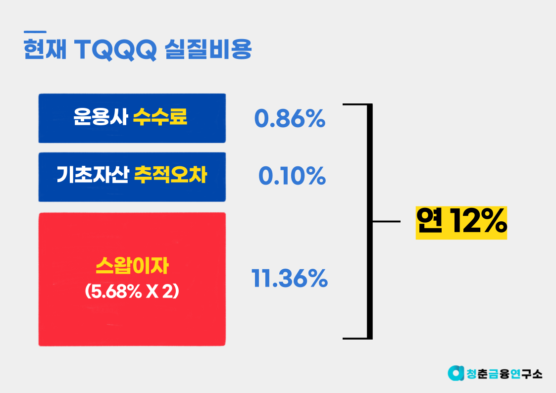 하지만 이 세상에 공짜는 없듯이 QQQ 가격변동에 기반한 수익을 얻어가는 만큼 이에 대한 스왑이자 비용을 지불해야 합니다. 이 비용이 바로 TQQQ에 숨어져 있는 비용이라고 할 수 있는데요.