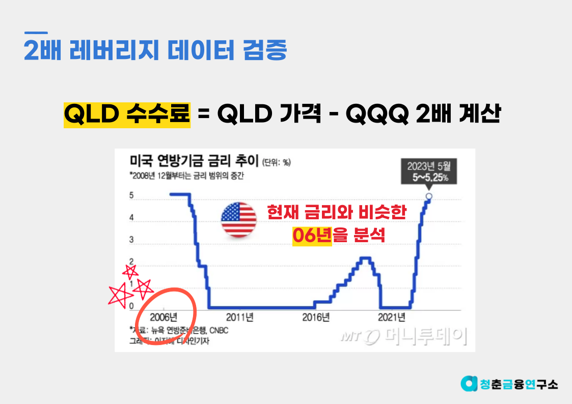 현재 기준금리 5%대와 유사했던 2006년에 당시 상장해 있던 QLD의 가격과 QQQ를 2배로 환산한 금액의 차이를 QLD의 실질적인 수수료로 생각하고 검증을 진행한 건데요.