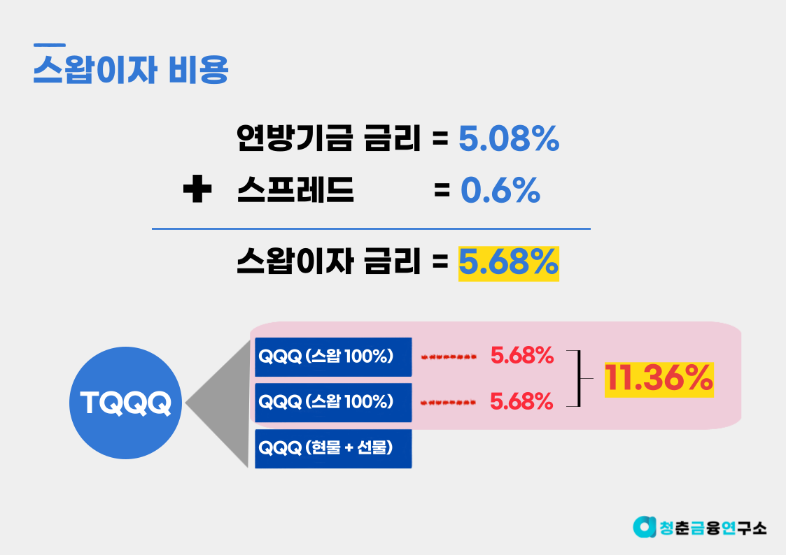 하지만 이 세상에 공짜는 없듯이 QQQ 가격변동에 기반한 수익을 얻어가는 만큼 이에 대한 스왑이자 비용을 지불해야 합니다. 이 비용이 바로 TQQQ에 숨어져 있는 비용이라고 할 수 있는데요.