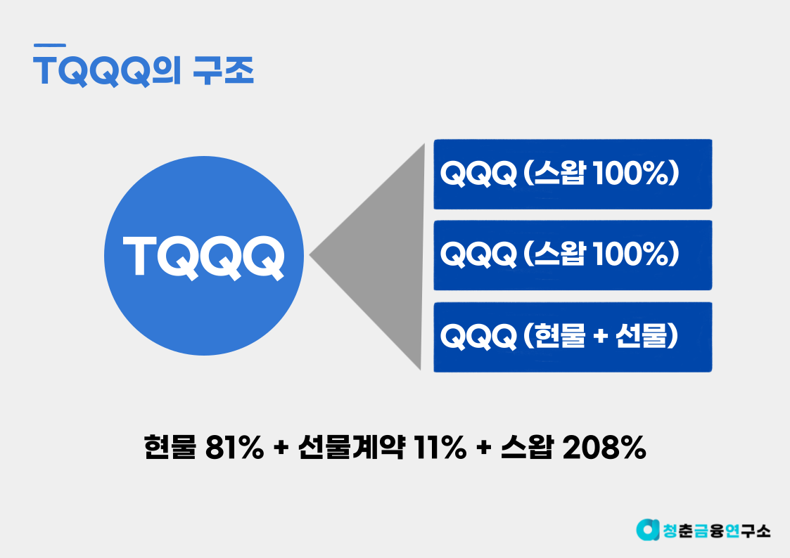 3배 레버리지 ETF의 수수료 체계를 이해하기 위해서는 3배 레저리지가 어떻게 구현되는지에 대한 이해가 선행되어야 하는데요. TQQQ를 예로 들어 3배 레버리지 ETF 상품들의 구조를 간단히 살펴보도록 할게요.