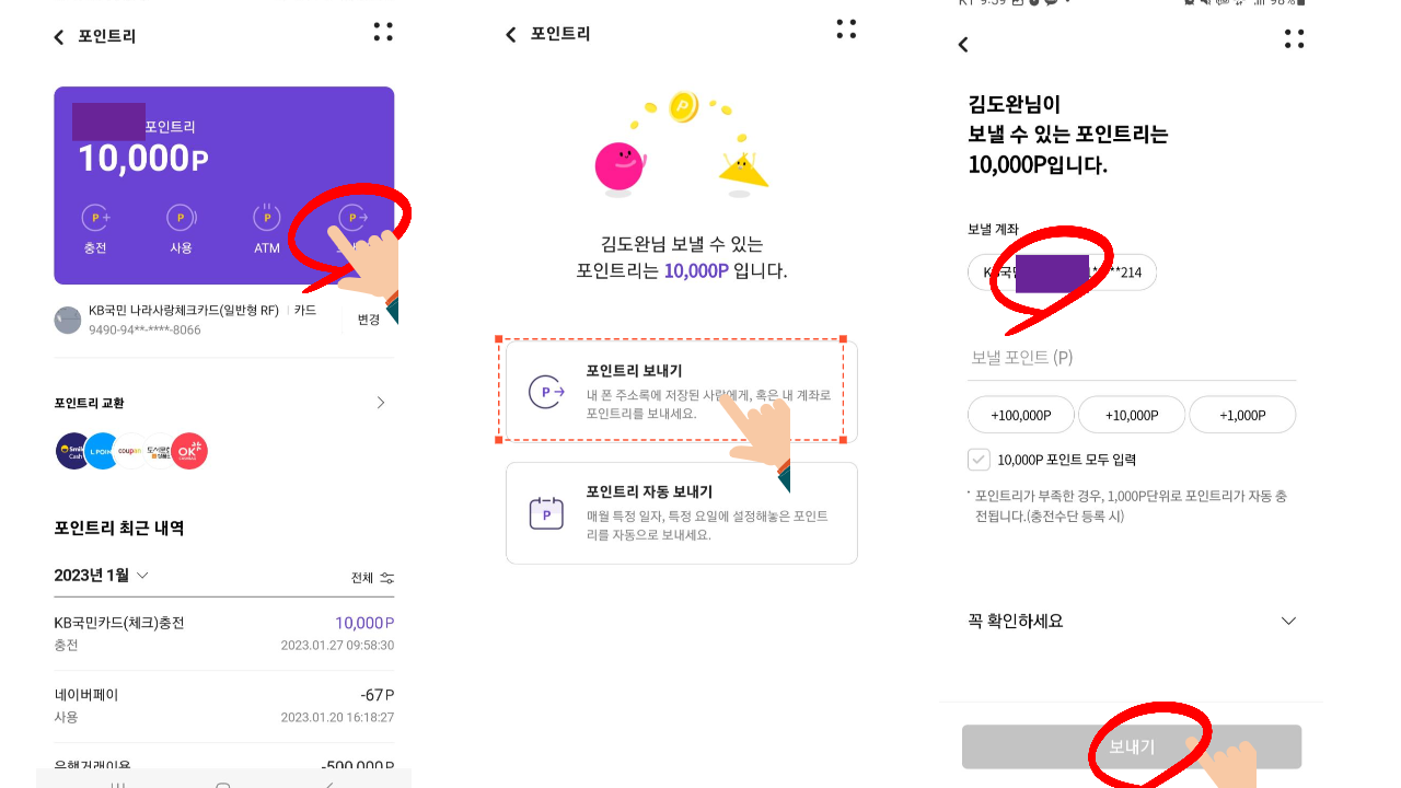자신이 원하는 계좌번호를 입력하고 보내게 되면 포인트리로 전환된 금액이 1:1로 다시 현금으로 입금됩니다. 국민은행 계좌 이외에도 타행 계좌도로도 포인트리를 현금으로 보내는 것이 가능하니 참고하세요!