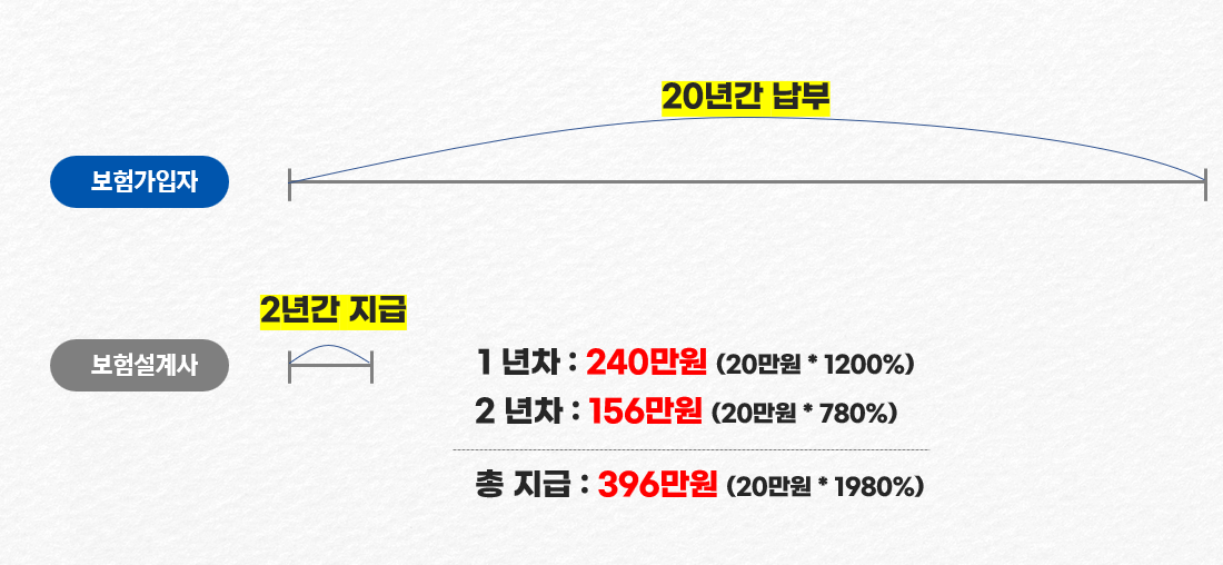 위에 표에서 보듯 보험판매에 대한 수당은 빠르면 1년, 늦어도 2년 사이에 지급이 완료됩니다. 즉, 이러한 수당체계로 인해 보험설계사분들 입장에서도 '고객의 보험금 완납' 보다는 '새로운 보험 가입'에 초점을 맞출 수밖에 없는 구조입니다.