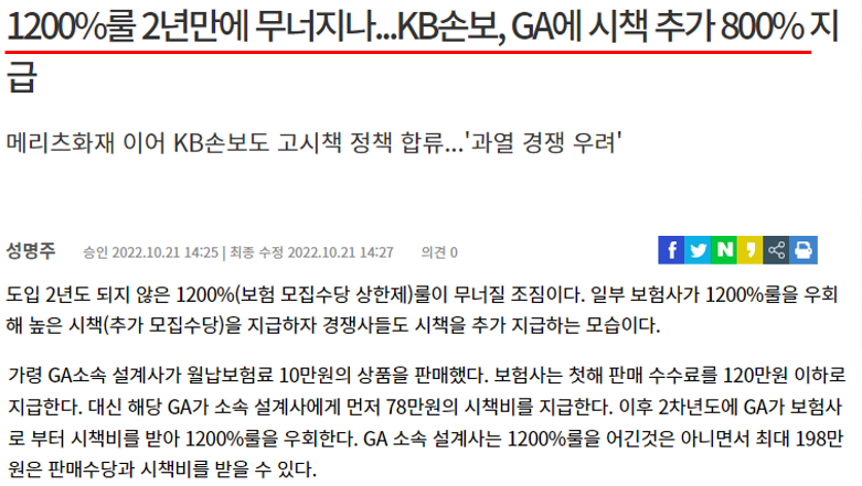 즉, 월 보험료가 10만 원인 상품에 가입하게 되면 보험설계사에게는 최대 230만 원까지 수당이 지급될 수 있는 구조라는 겁니다. 2020년을 기준으로 1200% 룰(보험 모집수당 상한제)이 실시되고는 있지만 아래 기사에서 보듯 대부분의 보험사들이 우회하여 월 보험료의 2000% 가까운 수당을 지급하고 있는 걸 확인할 수 있네요.